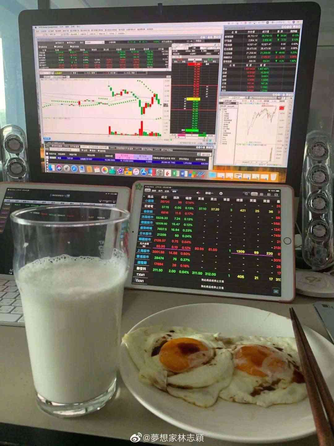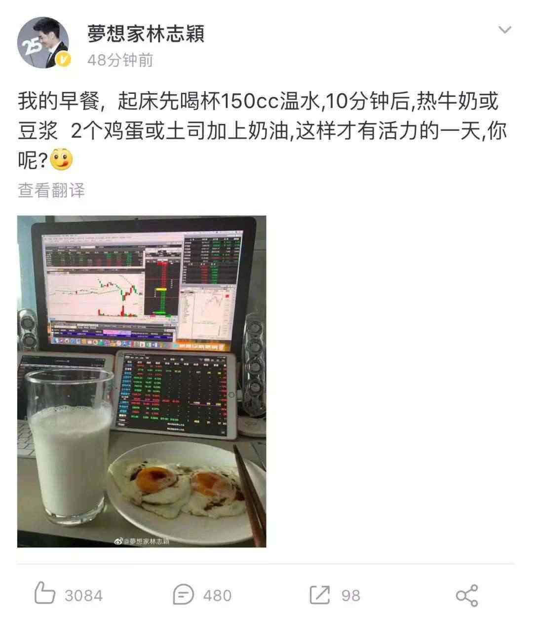 前两天,不老男神林志颖发了一条早餐的微博,看似随性的早餐背后,竟然是几块股票交易屏幕!