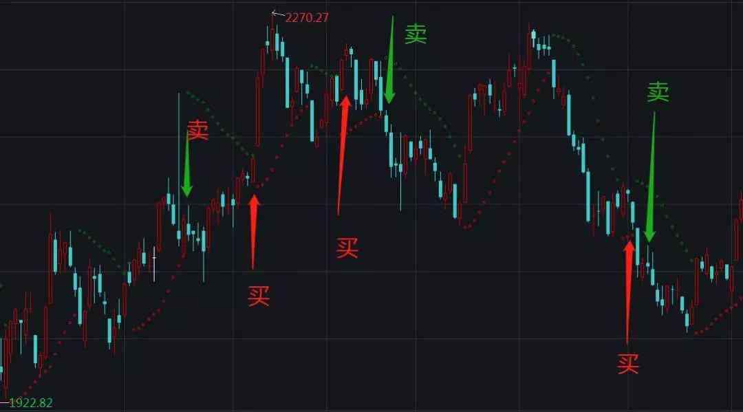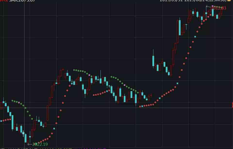 抛物线转向(SAR)也称停损点转向,其全称叫“Stop and Reveres”,顾名思义,这个指标就是用来判断反转的,SAR的运用方法十分简单,当曲线由绿色转变为红色的时候,买入;由红色转变为绿色时,卖出。