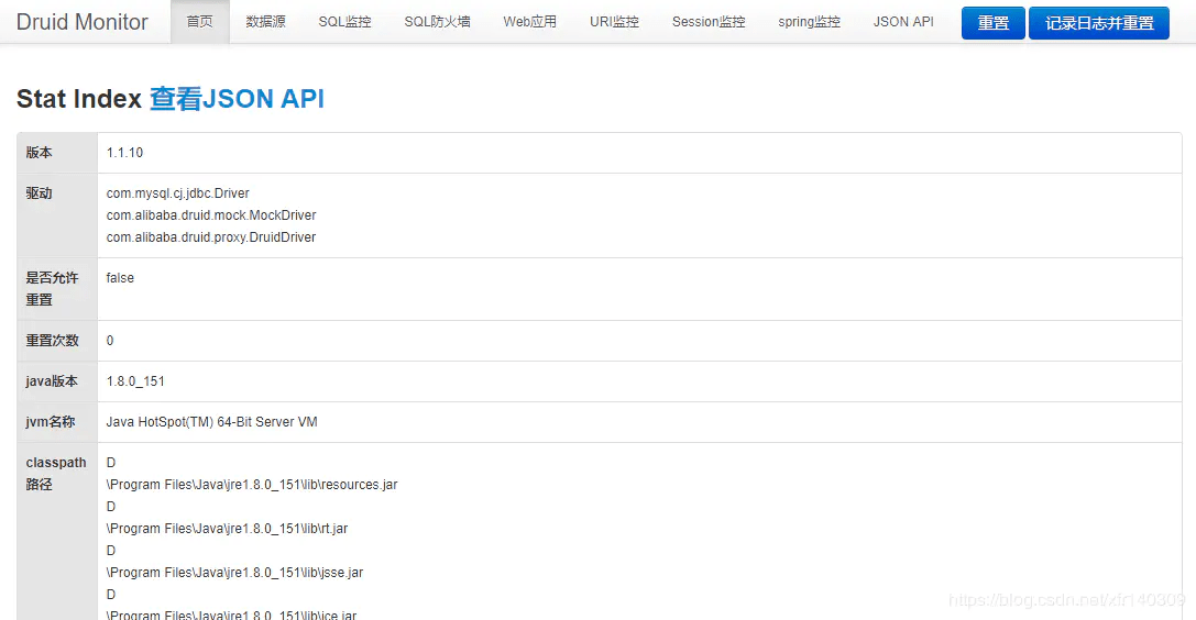 进入Druid的登陆页面,输入我们在配置文件中配置的用户名和密码登陆,进入下面的页面: