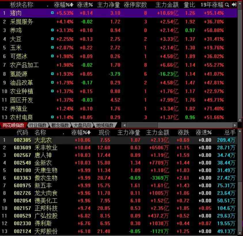 以4.22为例,涨幅居前的有猪肉、采掘服务、养鸡、可燃冰等等,猪肉和养鸡涨幅居前的原因是农产品价格上涨,3月PMI指数高于预期,而且这两个板块持续上涨多日,后市是具备继续上涨潜力的,猪肉板块龙头是傲农生物、唐人神和天康生物,后期如果要入手猪肉板块,首选这三支。