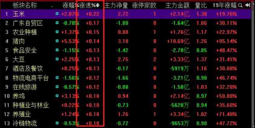 分析完涨跌幅排行之后,你还可以分析一下涨速排行榜,这代表了尾盘资金涌入最积极的板块,这些板块明天大概率是开盘就会涨,比如第二天猪肉玉米多半又是上涨的一天,郭台铭和福建还会下跌。